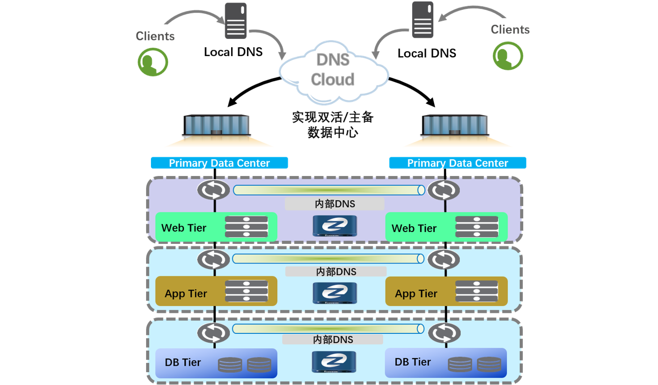数据中心为提高应用系统的可靠性,实现多站点资源分布式部署,提高资源的利用率,需要多站点的应用系统构建成多活或主备工作模式。为了与IP地址解耦,通常会使用域名系统(DNS)来调度这些应用。龙8国际官网多数据中心域名(DNS)解决方案以IT整体架构为蓝图,以业务陆续在性保障为目标,利用域名解析门户应用调度功能,可将用户访问流量引流到可靠、可用的数据中心进行访问,既能保证用户的使用体验,又能达到应用容灾的无感切换的目的。